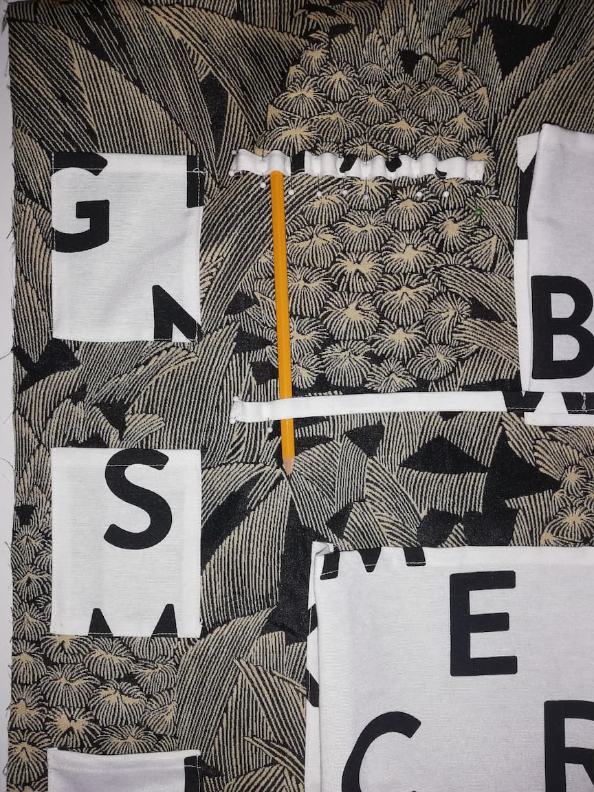 12/ Positionner l’une des bandes à 1.5 cm de la première poche plaquée (la plus haute), au niveau du haut de celle-ci. Coudre l’extrémité pour fixer la bande au tissu support n°1. Positionner ensuite un crayon sous la bande, plaquer celle-ci sur le crayon et épingler pour la fixer sur le tissu n°1. Coudre au niveau de ce marquage.