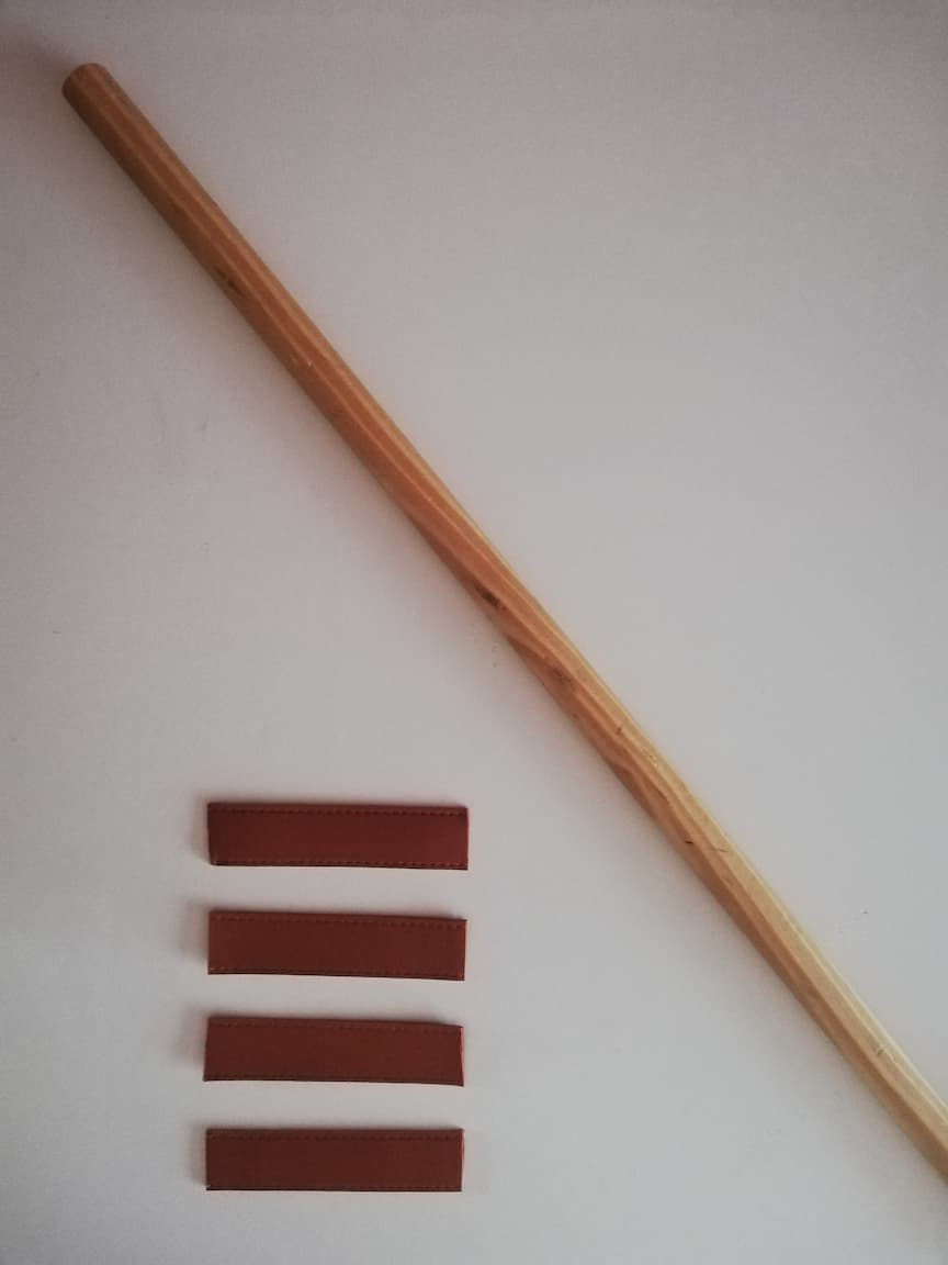 14/ Pour finir, couper le morceau de cuir en 4 morceaux de longueur identique. Couper le manche à balai en bois en un morceau de 80 cm de longueur.