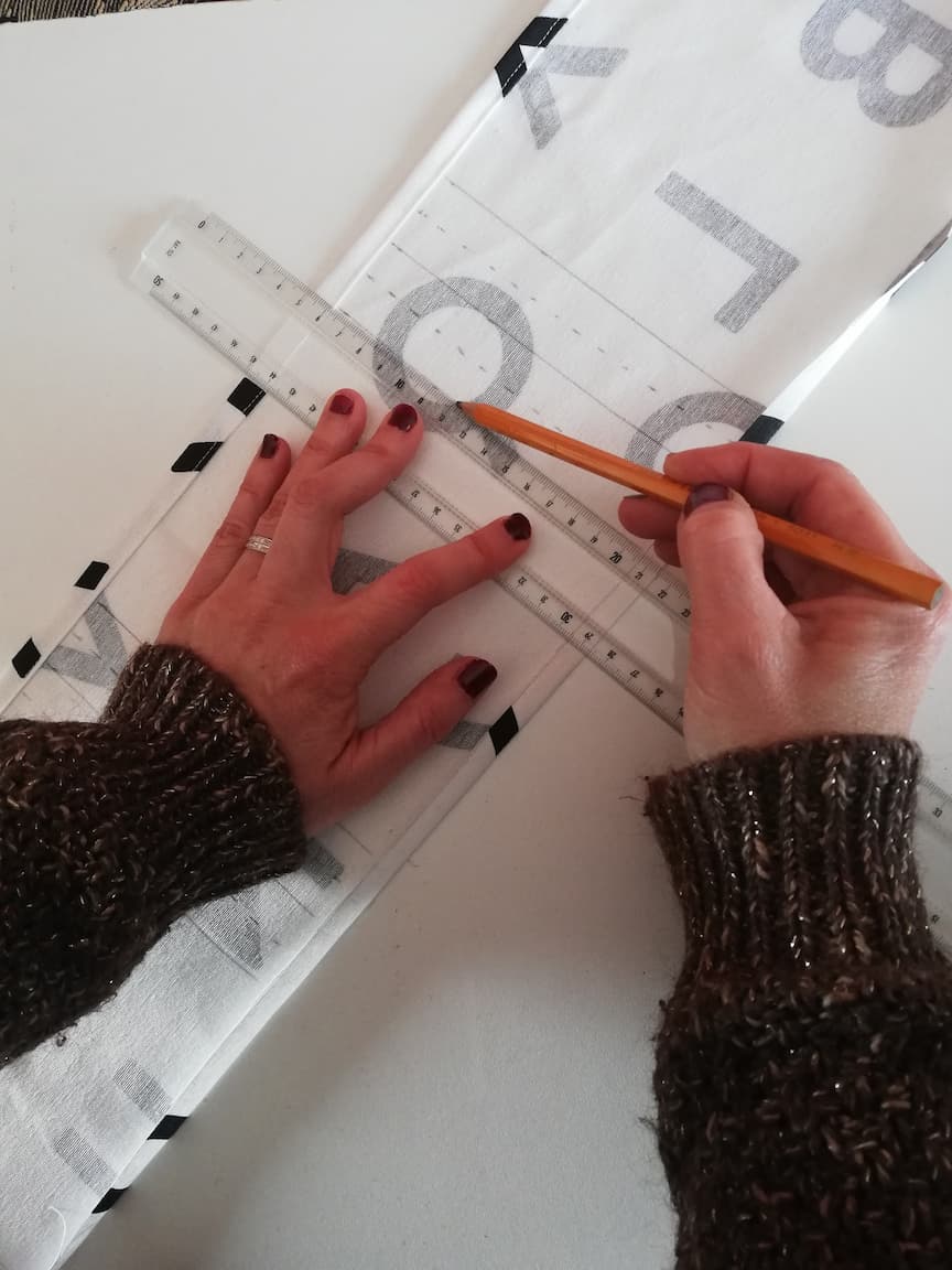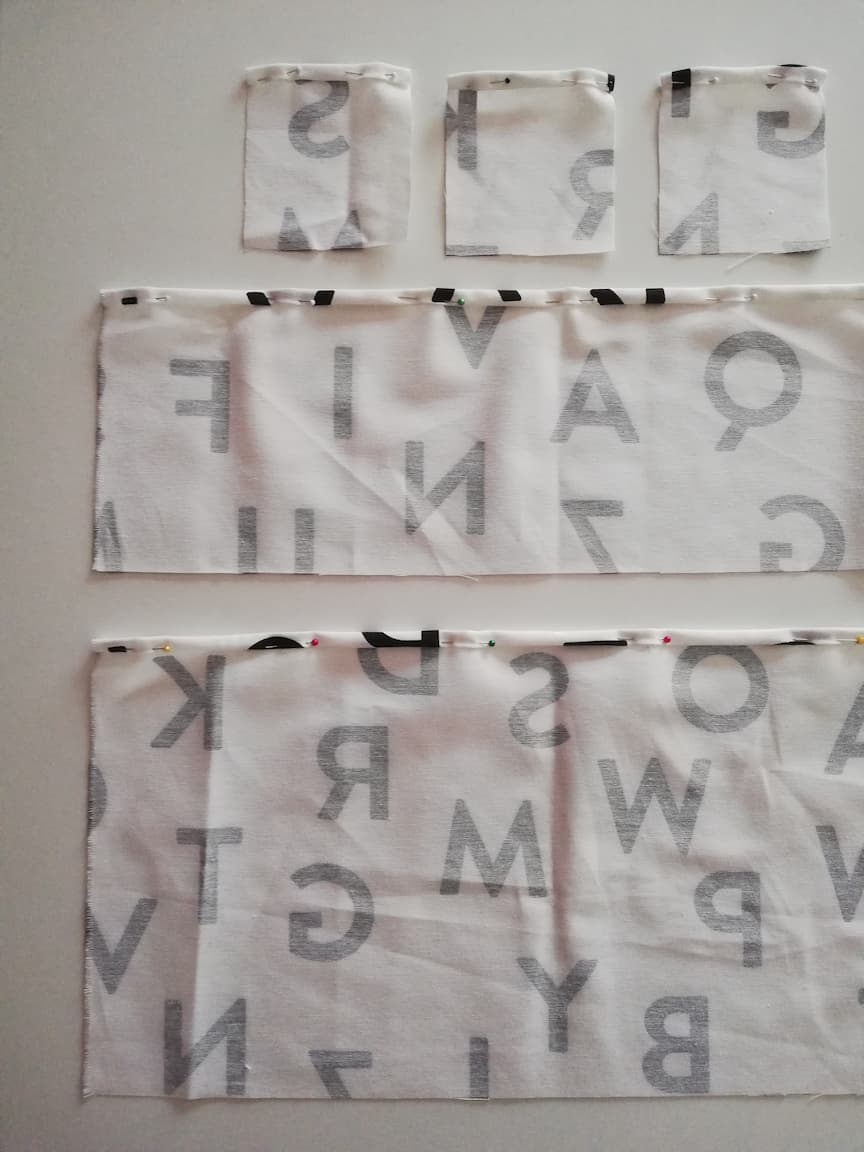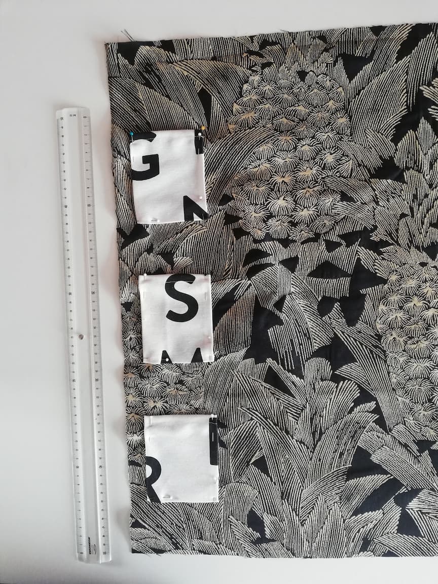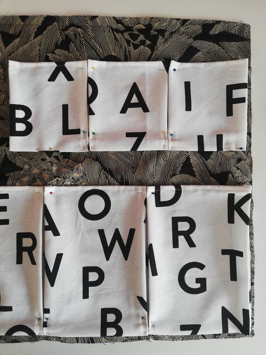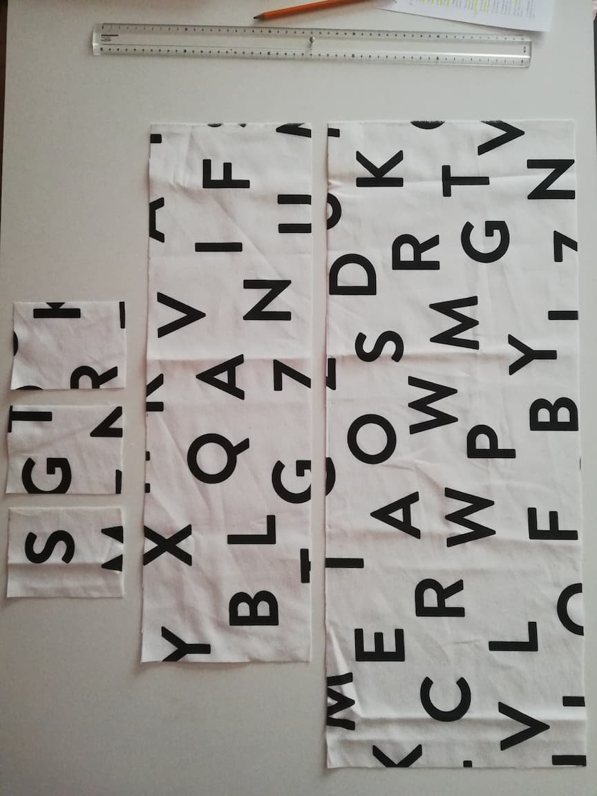 4/ Le tissu n°2 (ici le tissu en toile de coton blanc à lettres imprimées noires) sera utilisé pour réaliser les différents rangements à répartir sur le premier tissu. Ainsi, découper :