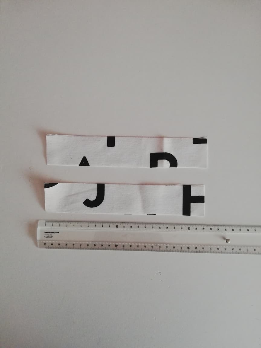 11/ Prendre maintenant les bandes de tissu n°2 de H4*L20 cm, et replier 1 cm sur chaque longueur. Puis, les plier en deux sur elles-mêmes, envers contre envers, et coudre à 2 mm du bord. Rentrer ensuite les extrémités sur 1 cm, et à nouveau, coudre à 2 mm du bord. Les bandes sont prêtes !