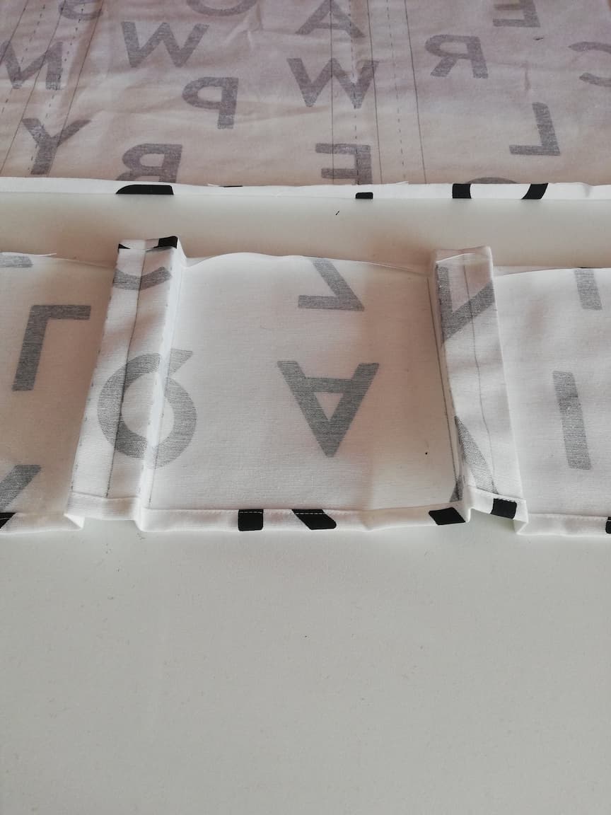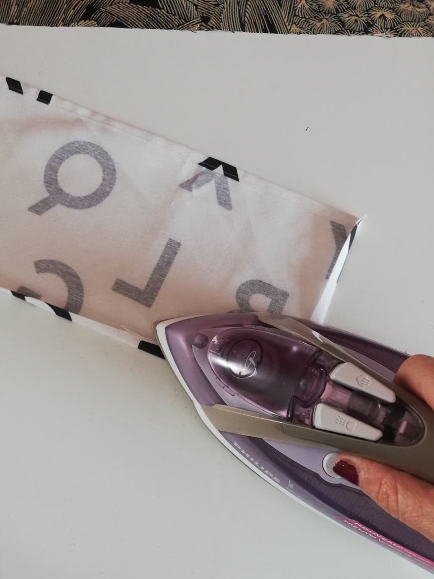 6/ Sur chaque côté et sur chaque bord inférieur de chacune des poches coupées dans le tissu n°2, plier sur 1 cm de tissu envers contre envers. Ensuite, fixer le pli à l’aide du fer à repasser.